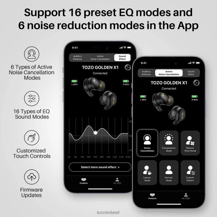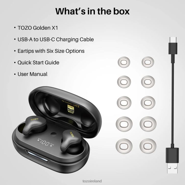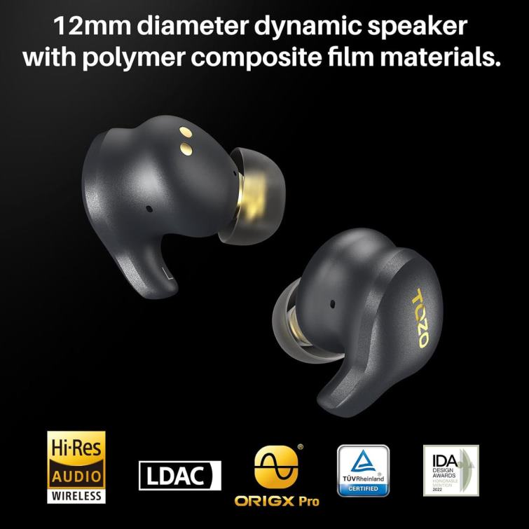 The TOZO Golden X1 utilizes a combination of a 12mm dynamic driver and a customized Knowles balanced armature driver, delivering a Hi-Fi-level listening experience with an ultra-wide frequency response range of 12Hz to 44.1kHz that far exceeds your hearing range. It also supports LDAC high-definition audio decoding and has obtained Hi-Res Audio certification.